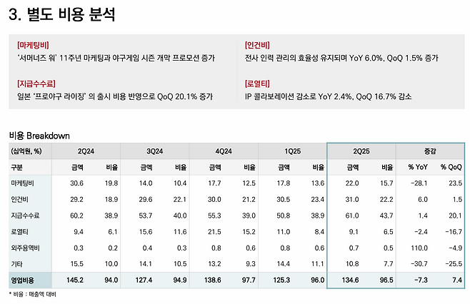 - 2025년 2분기 연결 영업 비용 1,834억 원(+6.9% YoY, +10.3% QoQ) ㄴ 주력 게임 마케팅비 강화에 기인해 전분기 대비 증가