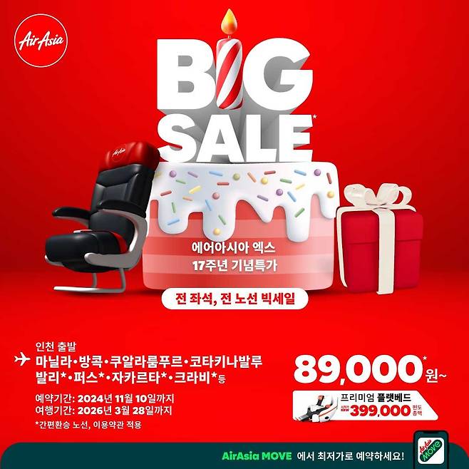에어아시아는 11월 10일까지 내년과 내후년 탑승을 위한 항공권에 대해 '빅세일(BIG Sale)' 프로모션을 진행한다고 밝혔다.