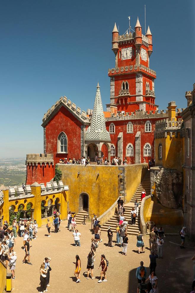 페나 궁전(Palácio da Pena)은 입장료 약 14유로, 전망대에서 바라보는 산맥과 대서양은 감탄이 저절로 나올 만큼 압도적이에요.