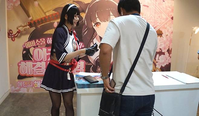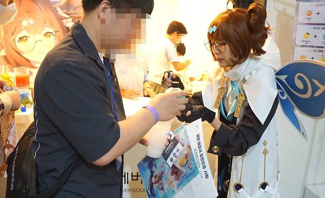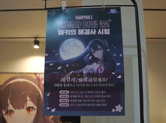 2층으로 입장한 후에는 다양한 정령들과 이벤트를 즐길 수 있었습니다. 아키와의 해결사 시험, 에리카의 포션 제조, 지호의 달달한 행복 뽑기 등 각자 정령에 어울리는 이벤트에 참가해 스탬프를 받을 수 있었습니다. 각각의 부스에는 해당 캐릭터들의 코스튬 플레이어가 유저들을 친절히 안내해 주었죠. 그리고 갤러리에서 통해 에버소울의 다양한 아트를 감상할 수 있었습니다.