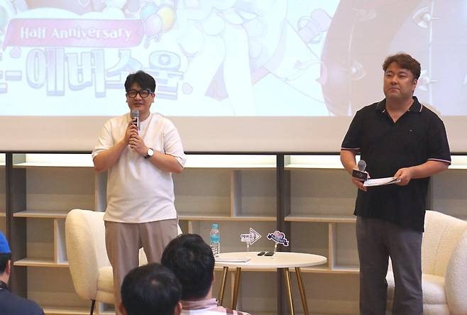 첫 코너로는 나인아크 이건 대표와 김철희 디렉터의 개발 비하인드를 소개하는 코너가 진행되었습니다. 이건 대표가 제시한 주제와 질문에 대해 김철희 디렉터가 답변하는 방식이었습니다. 차후에 에버소울 공식 유튜브를 통해 개발 비하인드와 Q&A 영상도 업로드될 예정이라고 하네요.