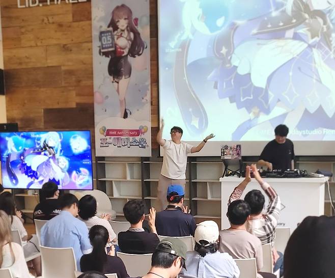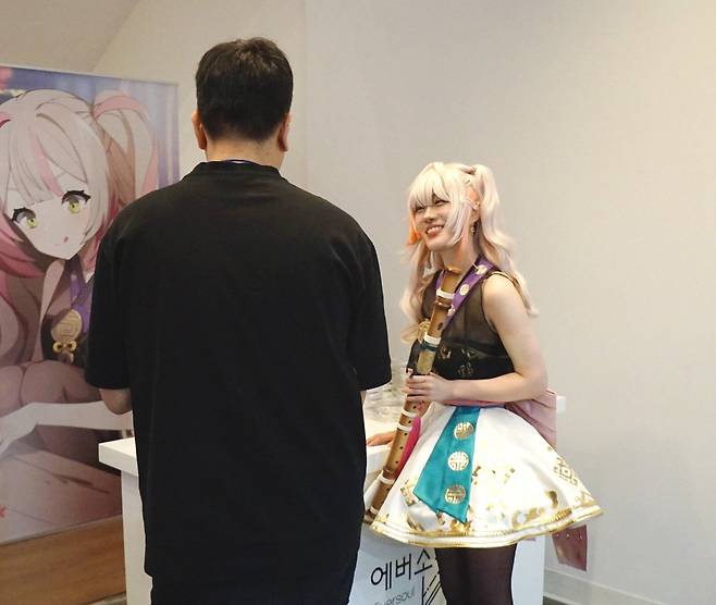 정령들과의 이벤트 후에는 3층에서 메인 이벤트가 진행됐습니다. 먼저 에버소울에 참여한 성우분들의 축하 메세지가 이어진 후, 에버소울의 다양한 노래를 이용한 DJ 먼데이스튜디오의 DJ 공연이 포문을 열었습니다. 에버소울은 공식 OST나 성우 노래 이외에도 다양한 아티스트와 콜라보를 한 노래도 다수 존재하기 때문에 풍성한 디제잉 공연을 감상할 수 있었네요.