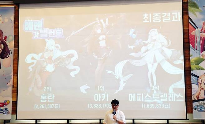 개발 비하인드 이후에는 에덴 갓 탤런트의 순위 발표가 있었습니다. 에덴 갓 탤런트는 지난 달 6월부터 7월 초까지 진행된 이벤트로, 게임 내 활동을 통해 얻은 투표권로 인기 투표를 할 수 있었는데요. 1등을 차지한 정령에게 캐릭터 테마곡과 아이돌 코스튬을 배포할 예정이었습니다.