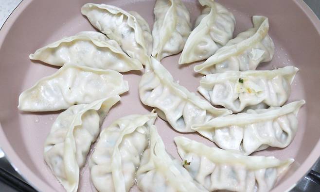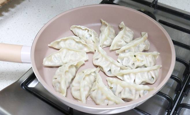 프라이팬을 준비해 냉동상태의 만두를 그대로 올려주세요. 만두 사이가 너무 붙지 않게 간격을 두는 것이 좋아요.