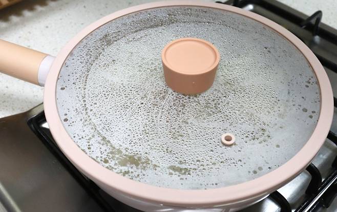 타닥타닥 소리가 줄어들고, 팬 안에 물기가 거의 다 날아갈 때까지 그대로 두세요. 뚜껑을 자주 열지 않고 그대로 두는 것이 중요합니다.
