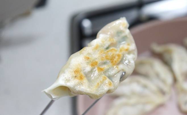 이 과정에서 수증기가 발생하면서 만두 속은 쪄지고, 밑면은 익어가며 바삭한 식감을 만들어요. 이 과정을 해야 찜기 없이도 쫄깃함과 바삭함을 동시에 느낄 수 있어요.