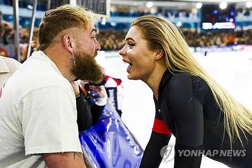 epa11797861 Dutch speed skater Jutta Leerdam and her partner, US boxer and influencer Jake Paul on the second day of the Dutch sprint speed skating championships in Thialf, in Heerenveen, Netherlands, 29 December 2024. EPA/Vincent Jannink