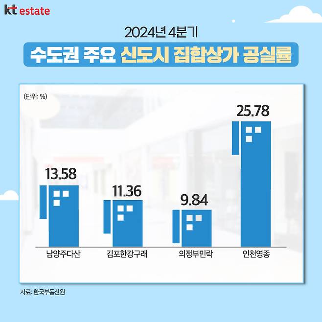 한국부동산원에 따르면, 지난해 4분기 수도권 주요 신도시의 집합 상가 공실률은 남양주 다산이 13.58%, 김포한강구래의 경우는 11.36%로 높은 수준을 기록했습니다. 의정부 민락 역시 9.84%를 기록해 10%대가 멀지 않아 보입니다. 특히 인천 영종신도시 상가 공실률이 25.78%을 기록, 4곳 중 1개 이상의 상가가 비어 있는 상황입니다.