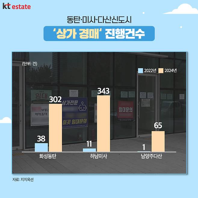 상황이 이렇다 보니 신도시 내 수많은 상가가 결국 경매시장으로 내몰리고 있습니다. 부동산 경매 전문업체인 지지옥션이 지난달 12일 발표한 자료에 따르면, 경기도 화성 동탄과 남양주 다산, 하남 미사 등 세 개 신도시에서 진행되는 상가 경매 진행 건수가 2022년 50건에서 2024년 710건으로 14배 이상 증가했습니다. 특히 남양주 다산의 경우, 2022년에는 상가 경매가 단 1건만 있었으나, 2024년에는 65건으로 무려 65배나 증가했습니다.