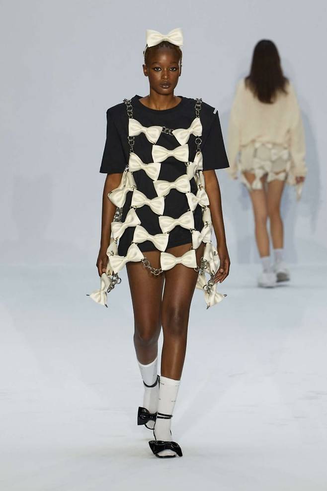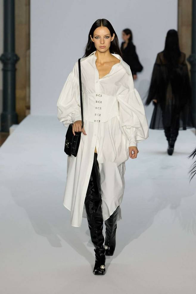 김해김의 디자인은 전반적으로 미니멀하고 구조적인 실루엣에 진주, 리본, 머리카락, 라벨 등의 디테일이 예상을 벗어나는 부분에 더해지는 것이 특징입니다. 지난해 말 공개된 2024 Spring 컬렉션에서도 이와 같은 김해김 디자인의 특성이 잘 드러나죠. 여기에 소매 부분이 과장된 퍼프 슬리브와 바디 라인을 강조한 코르셋의 대조 등은 이번 시즌만의 색다른 분위기를 더해줬습니다. 이번 컬렉션은 음양을 상징하는 블랙과 화이트 색상만 사용되기도 했는데요. 자칫 지루하게 느껴질 수 있는 모노톤의 컬렉션이지만, 다채로운 아이디어 덕분에 룩 하나하나를 살펴보는 재미가 있는 컬렉션이었습니다.