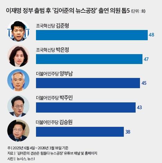 이외에도 민주당에선 이건태(22회), 김기표(22회), 김병주(21회), 최민희(14회), 박범계(13회), 이용우(13회), 윤건영(11회), 추미애(11회), 김현(10회) 의원이 두 자릿수 출연 기록을 세웠고 정청래 대표는 6회 출연했다. 조국혁신당의 경우 신장식 의원이 19회 출연했다. 같은 기간 여당인 민주당 현역의원 161명 중 78명이 뉴스공장에 출연했고, 조국혁신당에선 조국 대표(5회)와 현역의원 12명 중 절반인 6명이 모습을 드러냈다. 현역 자치단체장 중에선 민주당 소속인 정원오 전 성동구청장(출연 후인 3월 4일 서울시장 출마 위해 사퇴)이 유일하게 4차례 출연했다. 경무관 출신인 이지은 민주당 마포갑 지역위원장은 22회 출연해 의원이 아닌 당직자 가운데 가장 많이 나왔다.