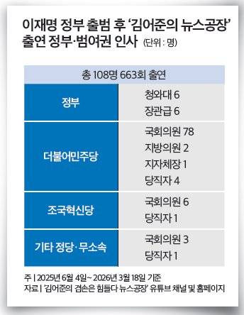 이재명 정부 출범 후 현재까지 뉴스공장에 등판한 정부 및 범여권 인사의 면면과 출연 빈도는 어떨까. 이 대통령 취임 후 현재까지 뉴스공장 방송이 진행된 199일(주말 및 공휴일을 제외) 가운데 나흘을 제외한 195일간 정부 장관급과 민주당, 조국혁신당 등 범여권 인사 108명이 총 663회 출연했다. 하루 평균 3.4명이 뉴스공장에 나온 셈이다. 가장 많은 날(지난해 7월 10일)에는 민주당과 조국혁신당 의원 9명이 뉴스공장 패널로 출연하기도 했다. 집계 대상인 정부 및 범여권 인사는 출연 당시 현직인 민주당과 조국혁신당 등 범여권 정당 소속 국회의원, 유력 당직자, 대통령비서실 참모, 정부 장관급 이상, 지방자치단체장과 지방의회 의원으로 한정했다.