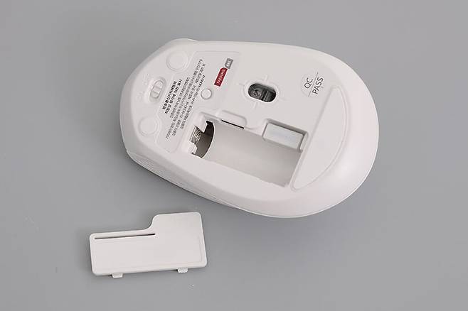 바닥 면 윗부분에 있는 작은 커버를 열어보면 배터리를 넣을 수 있는 공간이 나타난다. 배터리는 AAA 타입 2개를 사용한다.