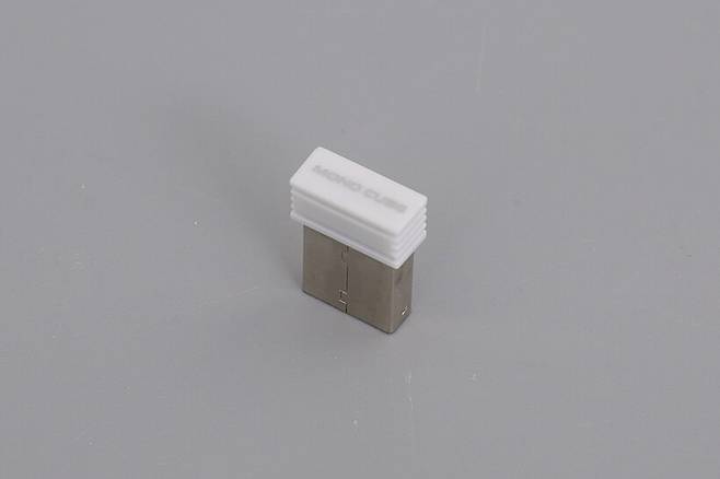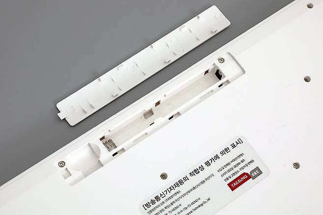 바닥 면에 있는 작은 커버를 열면 배터리를 넣을 수 있는 공간이 나타나며, USB 동글도 함께 들어 있는 것을 확인할 수 있다. 배터리는 AA 타입 한 개를 필요로 한다.