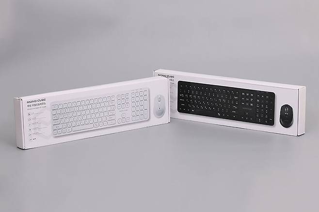 모노큐브 멀티페어링 블루투스 키보드 마우스세트는 길다란 흰색 박스에 담겨 있다. 박스 앞면에는 제품 사진이 인쇄되어 있는데, 박스 안에 들어 있는 제품과 같은 색상의 사진이 사용되어서 개봉 전에도 어떤 색상인지 확인 가능하다.