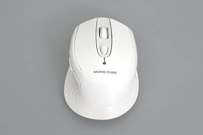 모노큐브 멀티페어링 블루투스 키보드 마우스세트에 포함되어 있는 마우스는 좌우 대칭 형태가 아닌 오른손잡이에 최적화된 입체적인 형태를 취하고 있다.