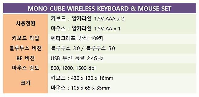 모노큐브 멀티페어링 블루투스 키보드 마우스세트는 블루투스와 2.4㎓ RF 연결을 모두 지원한다는 점에서 상당히 유용하다. 특히 키보드의 경우 블루투스 3.0과 블루투스 5.0을 모두 지원해 최대 3대의 기기와 동시 페어링이 가능해 데스크톱PC와 태블릿PC, 스마트폰까지 모두 연결하고 간편하게 전환해서 쓸 수 있어서 풀사이즈 키보드를 이용한 텍스트 입력의 편리함을 충분히 누릴 수 있다. 또한 마우스는 DPI 버튼을 이용해 세 가지 감도를 손쉽게 변환할 수 있어서 정교한 작업이나 빠른 반응성이 필요한 상황에 간편하게 대응할 수 있다. 그뿐만 아니라 윈도우와 맥, 안드로이드 세 가지 OS에 최적화된 레이아웃을 선택할 수 있기 때문에 더욱 다양한 환경에서 유연하고 편리하게 쓸 수 있다는 점이 가장 큰 장점이라고 할 수 있다.