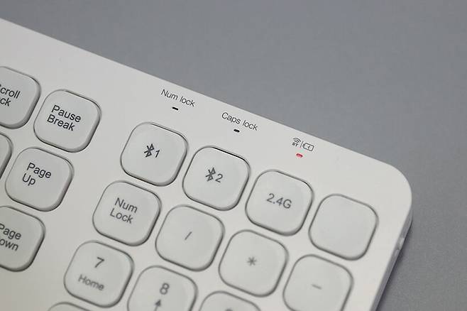 이 버튼들은 블루투스 3.0과 블루투스 5.0, 그리고 2.4㎓ RF 무선 연결 선택 버튼으로, 두 개의 블루투스 연결과 하나의 RF 연결이 가능한 것이다. RF 연결의 경우 마우스에 포함되어 있던 USB 동글을 이용해 사용할 수 있다. 즉, 키보드에 스마트폰과 태블릿PC, 데스크톱PC를 모두 연결해두고 각각의 기기로 전환해서 사용할 수 있다는 의미이다. 마우스는 블루투스 5.0과 2.4㎓ RF 연결을 지원해 두 개의 기기에 연결해서 바닥 면에 있는 버튼을 눌러서 전환할 수 있다.