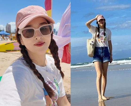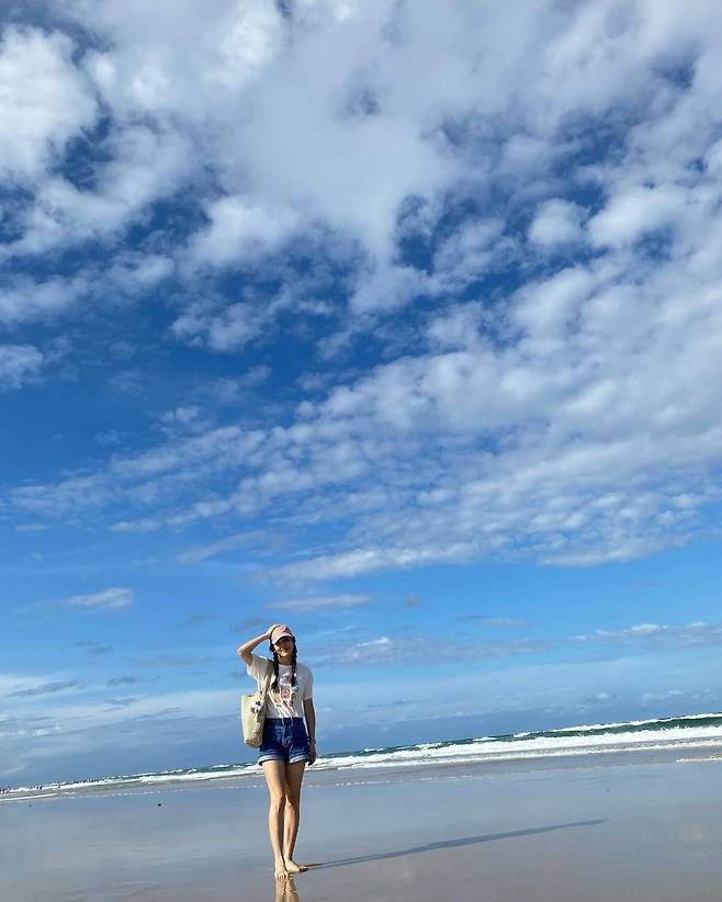 또 한혜진은 해변에서 맨발로 서서 햇살을 즐기는 모습으로, 특유의 건강미와 긴 다리를 돋보였습니다.