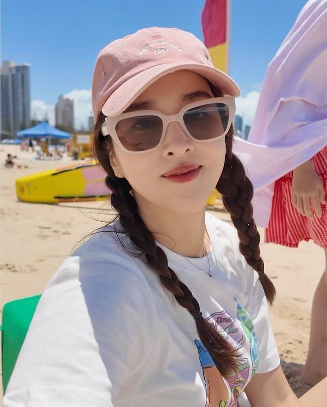 한혜진은 연한 핑크색 캡 모자와 그래픽 프린트가 돋보이는 화이트 티셔츠로 캐주얼한 비치룩을 완성했습니다.