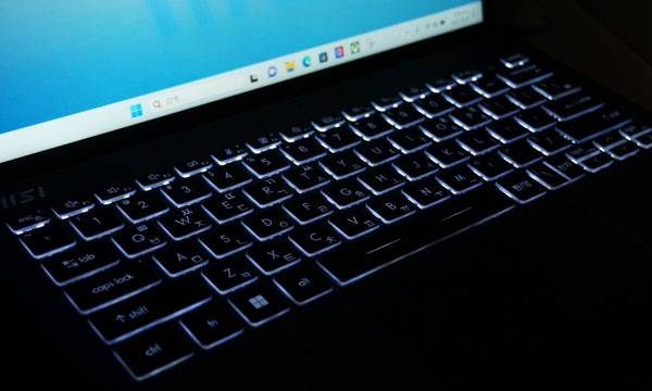 MSI 프레스티지 13 Evo A13M WIN11 키보드는 화이트 LED가 적용되어 어두운 곳에서도 쉽게 키를 식별할 수 있다. 게이밍 노트북처럼 화려한 RGB 컬러와 효과를 지원하지 않지만 업무 환경에서 꼭 필요한 LED On/Off와 3단계 밝기 조절을 기능키(F8)로 원할 때마다 바로 바꿀 수 있다.