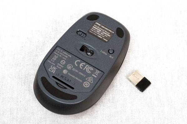 2.4GHz 및 BLE 모드 전환 버튼이 제공되어 2.4GHz RF 연결 또는 블루투스 연결 방식으로 사용자가 모드를 선택할 수 있다. 마우스 LED 표시가 2.4GHz일 때는 흰색, 블루투스일 때는 파란색으로 나오는데, PC가 블루투스 기능을 지원하지 못하거나 2.4GHz RF 방식으로 사용하고 싶다면 배터리 수납부 안에 들어있는 무선 수신기 동글을 USB 포트에 연결하면 된다.