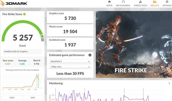 3D 그래픽 성능은 별도의 외장 그래픽 없이 코어 i7-1360P에 내장된 인텔 Iris Xe 그래픽으로 동작하는데, 3DMark Fire Strike에서 5,257점, Time Spy는 1,915점으로 인텔 Iris Xe 그래픽 평균적인 성능을 보여준다.