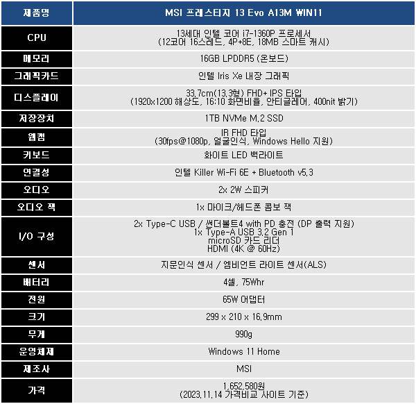 MSI 프레스티지 13 Evo A13M WIN11은 최신 노트북에 널리 사용되는 13세대 인텔 코어 i7-1360P 프로세서와 온보드 형태의 16GB LPDDR5-4800MHz 메모리가 들어간다. 저전력 모바일 CPU와 소비 전력이 낮은 LPDDR5 메모리 조합이지만 완전한 저전력을 컨셉으로 하는 으로 노트북 사용 시간 증가를 기대할 수 있다.