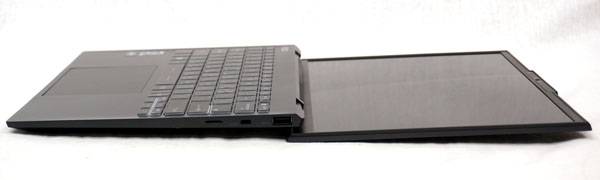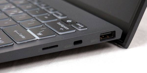 우측면에는 일반적인 USB 장치를 연결할 때 쓰는 USB 3.2 Gen1 Type-A 포트와 microSD 메모리 카드 슬롯, 켄싱턴 락 슬롯이 들어간다.