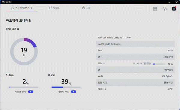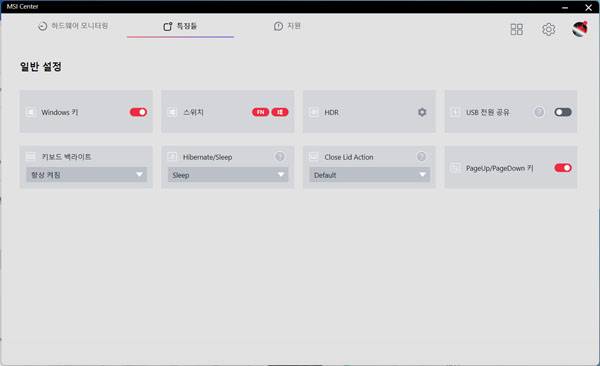 노트북 관리도 여러가지 앱을 복잡하게 설치하지 않아도 MSI 센터(MSI Center) 앱 하나로 하드웨어 모니터링부터 사용자 시나리오 설정, MSI 전용 기능 추가 기능 설치, 노트북 사용 옵션 조정, 라이브 업데이트와 같은 다양한 작업을 한 번에 처리할 수 있다.