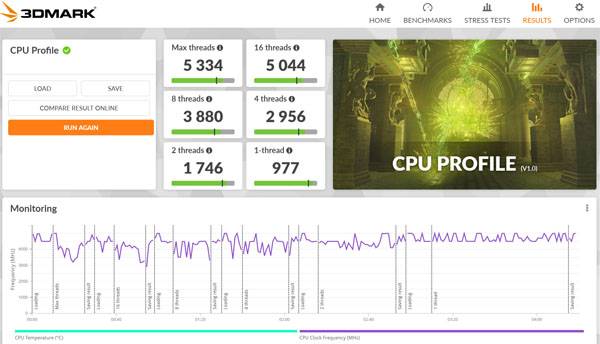 3DMark 벤치마크의 CPU 프로필 테스트를 살펴보면 MSI 프레스티지 13 Evo A13M WIN11에 탑재된 인텔 코어 i7-1360P 프로세서는 4P+8E 구성에 최대 12코어 16스레드를 지원하므로 P코어가 사용되는 4스레드까지 점수 향상폭이 크고 최종적으로는 싱글 스레드 대비 약 5.4배 가량의 점수를 기록해 CineBench R23과 비슷한 결과를 보여준다.