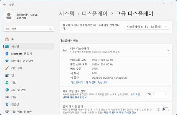 노트북 화면은 1920x1200 해상도에 60Hz 주사율로 FHD 영상 콘텐츠나 게임을 즐기는데 문제가 없을 뿐만 아니라 IPS 타입 패널로 상하좌우 최대 178도 광시야각으로 화면을 보여준다. 웹서핑이나 그래픽 작업에서도 원색에 근접한 컬러를 표현하는 sRGB 약 100% 색재현률을 가졌다. 야외에서도 비교적 선명하게 화면을 보여주는 400니트 밝기를 지원한다.