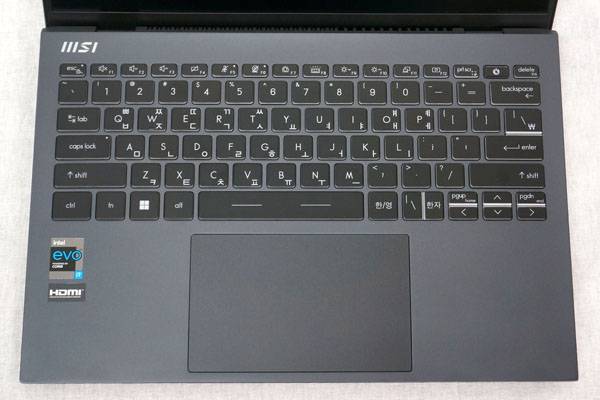 2-in-1 태블릿 PC에 들어가는 분리형 키보드 커버 형태 제품들은 두께 때문에 타건감이 떨어지는 경우가 많은데, MSI 프레스티지 13 Evo A13M WIN11에는 1.7mm 키 트래블로 쾌적한 타이핑 작업이 가능하다. 1열의 F1~F12 기능키들도 직관적이고 유용한 것들로 배치해서 작업 효율성을 높여준다.