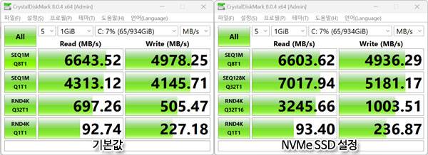 PCIe Gen3 기반의 SSD가 들어간 노트북들도 기존 SATA SSD/HDD에 비하면 스토리지 성능이 충분히 빠르지만, PCIe Gen4를 지원하는 1TB SSD가 탑재된 MSI 프레스티지 13 Evo A13M WIN11은 순차 읽기와 쓰기 속도 모두 PCIe Gen3 대역폭 한계를 뛰어넘는 모습을 보여준다.