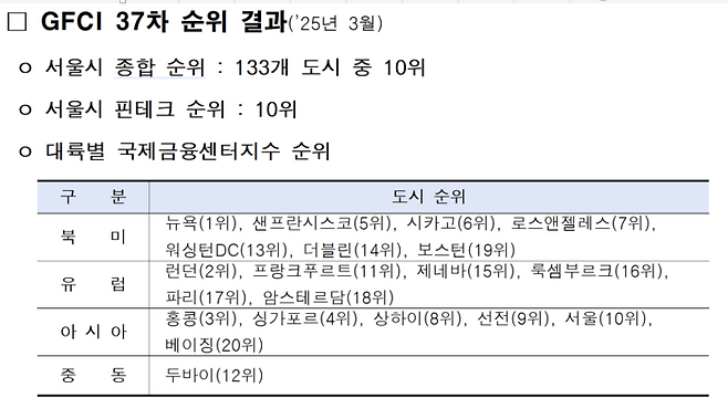 서울시 금융경쟁력, 파리·도쿄 제쳐…3년 연속 글로벌 ‘톱10’