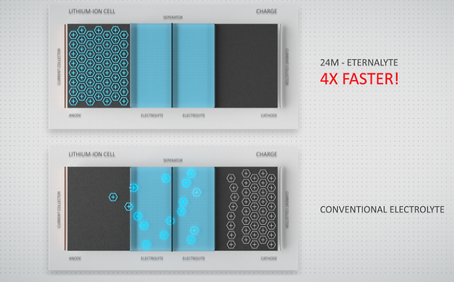 미국의 24M Technologies가 개발 중인 Eternalyte 전해질은 기존 리튬이온 배터리보다 4배 빠른 충전 속도를 목표로 한다. 기존 초고속 충전 인프라를 대폭 확장하지 않고도, 10분 충전으로 300km 이상 주행 가능한 수준을 꿈꾸며 EV의 실용성을 혁신적으로 향상시킬 것으로 보인다. 특히 새 전해질은 음극과 양극 사이의 이온 이동 속도(ionic conductivity)를 크게 향상시켜 이러한 성능을 가능하게 한다.
