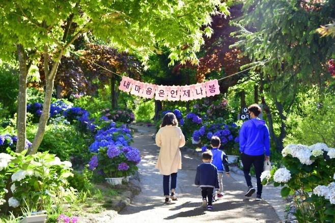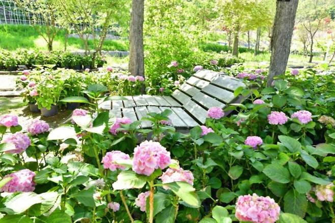 여름의 평강랜드는 새파랗게 발 아래를 수놓은 네모필라를 비롯하여 수국, 부레옥잠꽃, 주황 코스모스 등 다양한 여름 꽃이 만발해진다.