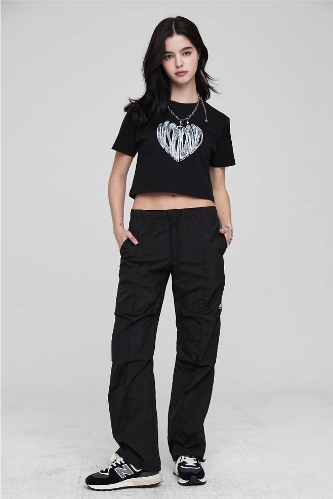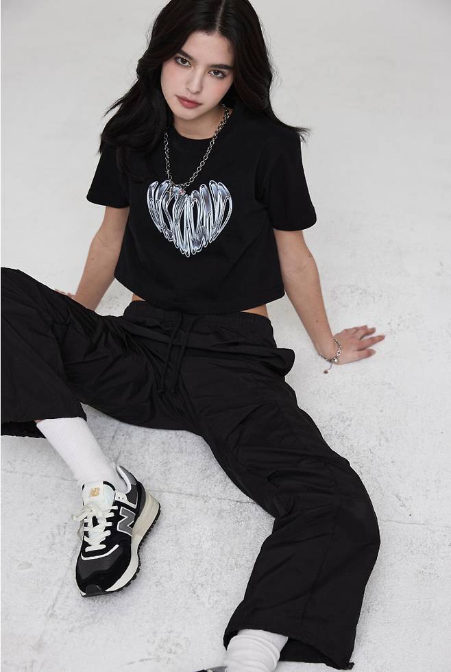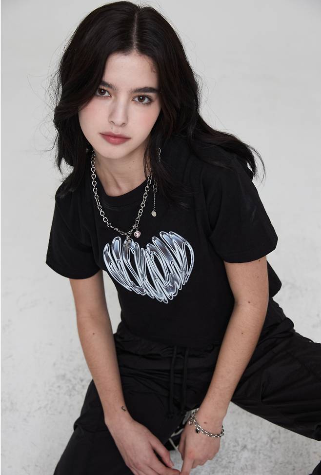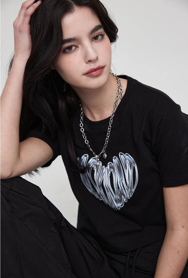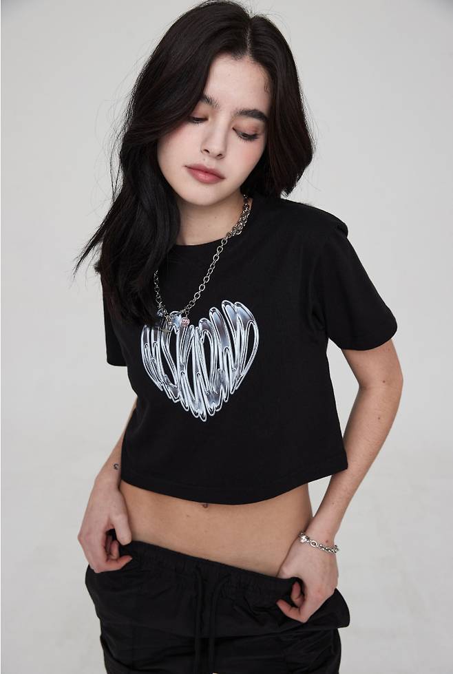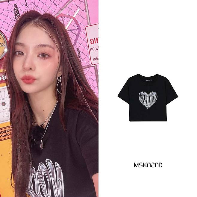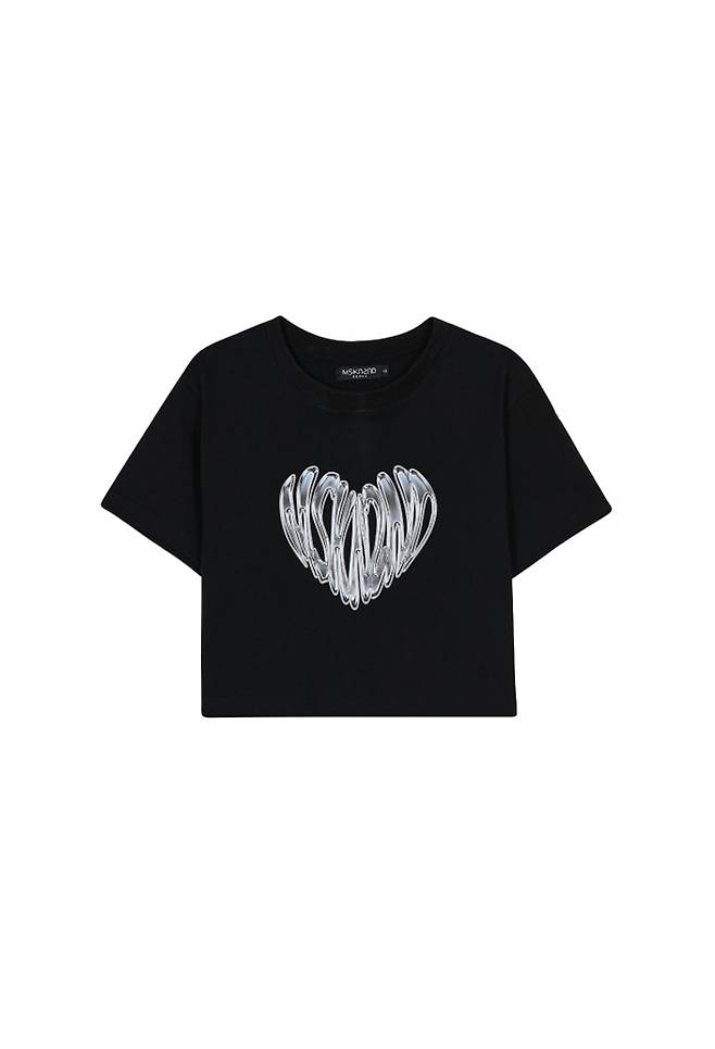 여성용 그래픽 프린트 크롭 티셔츠로 MSKN2ND 크롬 하트 아트워 전면 실사 후로피 프린팅이 포인트인데요.