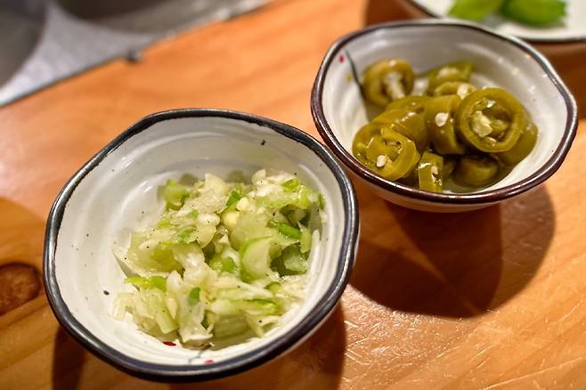 이곳은 전통적인 일본 징기스칸 방식을 분위기까지 그대로 재현했다. 좌석은 전체가 바 스타일로 고기를 구워주는 스탭과 마주하는 구조로 되어 있다. 함께 간 일행들과는 마주 보고 앉을 수 없는 구조이다. 그래서 여기는 단체로 가기는 조금 애매하다. 최대 5명까지 가봤는데 한계인 듯하다.