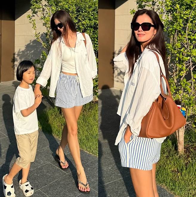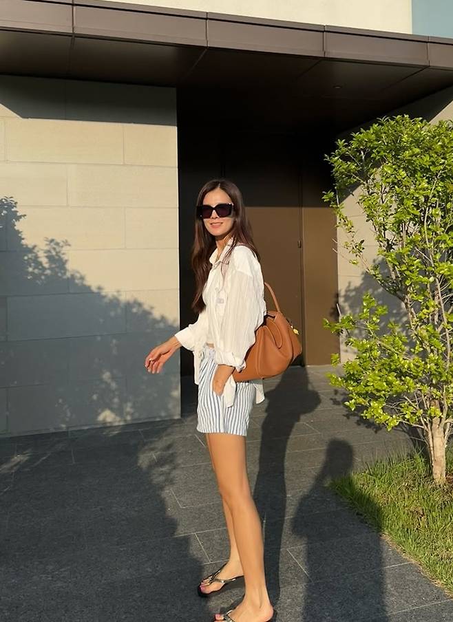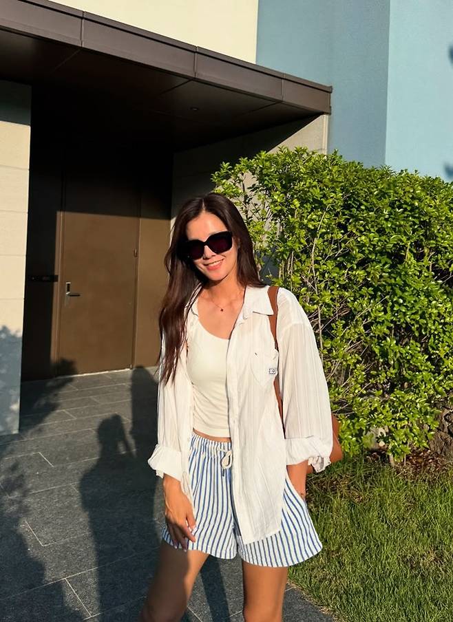 공개한 사진에서 김성은은 화이트 슬리브리스 톱 위에 얇은 소재의 스트라이프 루즈 핏 셔츠를 걸치고, 블루 스트라이프 패턴의 쇼츠를 착용한 톤온톤 컬러 매치의 바캉스룩으로 산뜻하면서도 프레시한 분위기를 자아냈다.