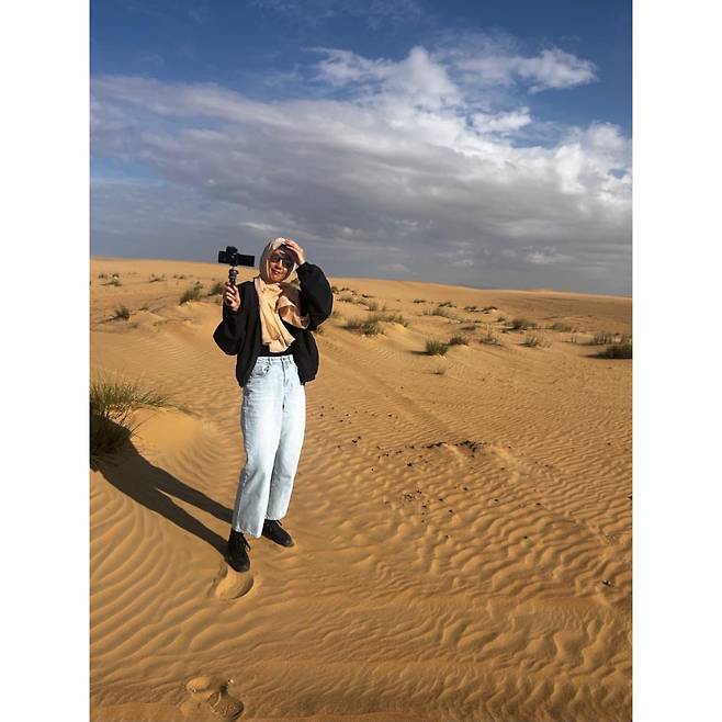 홍진경이 황금빛 사막을 배경으로 여유로운 여행 패션을 선보이고 있다. 베이지 톤의 스카프로 머리를 감싸고 검은색 재킷을 걸친 그녀는 밝은 청바지와 함께 실용적이면서도 스타일리시한 사막 여행 룩을 완성했다. 손에는 카메라를 들고 있어 여행의 순간을 담아내는 모습이 인상적이다. 특히 햇빛을 막아주는 선글라스와 함께 연출된 이 스타일은 모험적인 여행자의 면모를 잘 드러내고 있다. 사막의 강렬한 자연환경 속에서도 편안함과 세련됨을 동시에 추구하는 홍진경만의 감각이 돋보인다.