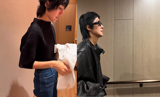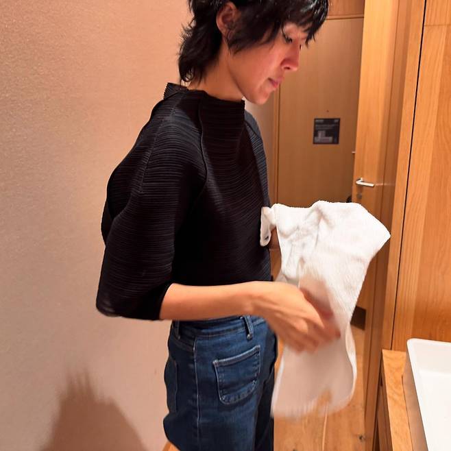 홍진경이 구조적인 디자인의 플리츠 상의를 입고 모던한 스타일을 선보이고 있다. 블랙 컬러의 하이넥 플리츠 상의는 독특한 텍스처와 실루엣으로 세련된 분위기를 자아내며, 심플한 청바지와 매치해 균형 잡힌 스타일링을 완성했다. 손에 든 흰색 수건은 일상적인 요소를 더해 친근한 느낌을 주면서도 전체적인 스타일의 완성도를 높이고 있다. 미니멀하면서도 디테일이 살아있는 이 룩은 홍진경의 세련된 일상 패션을 엿볼 수 있게 한다.