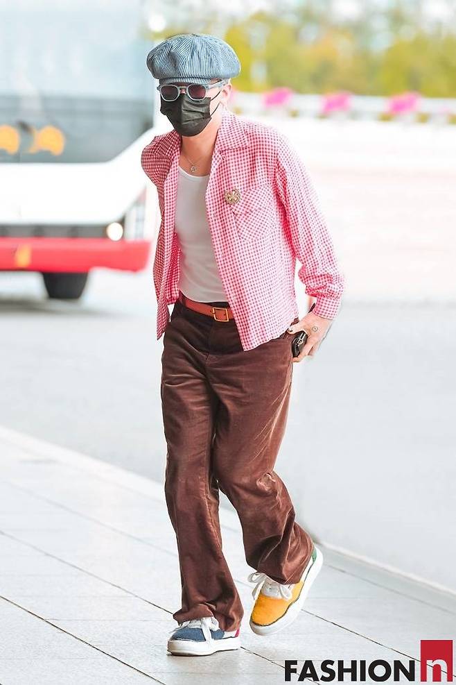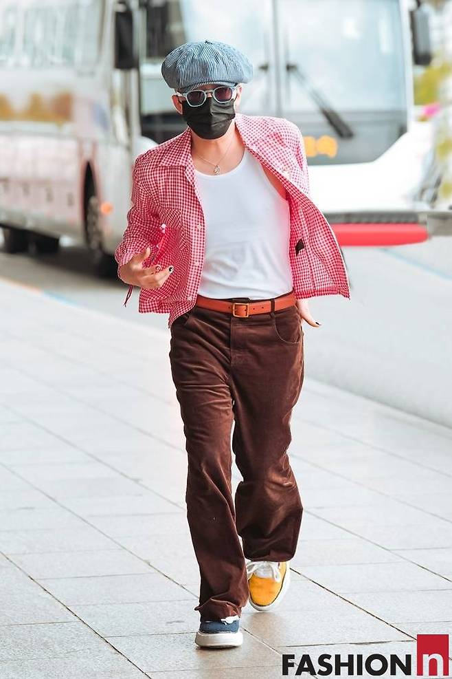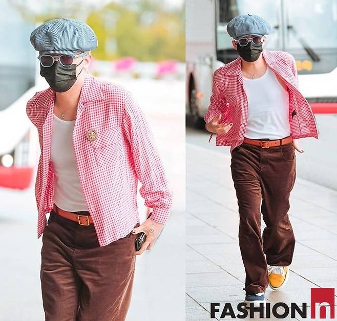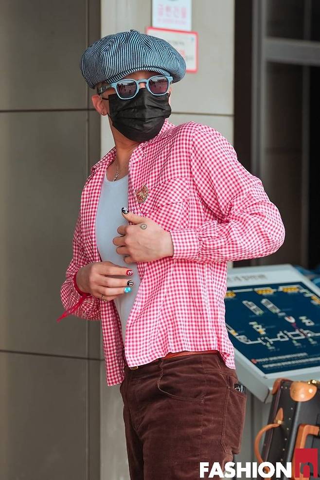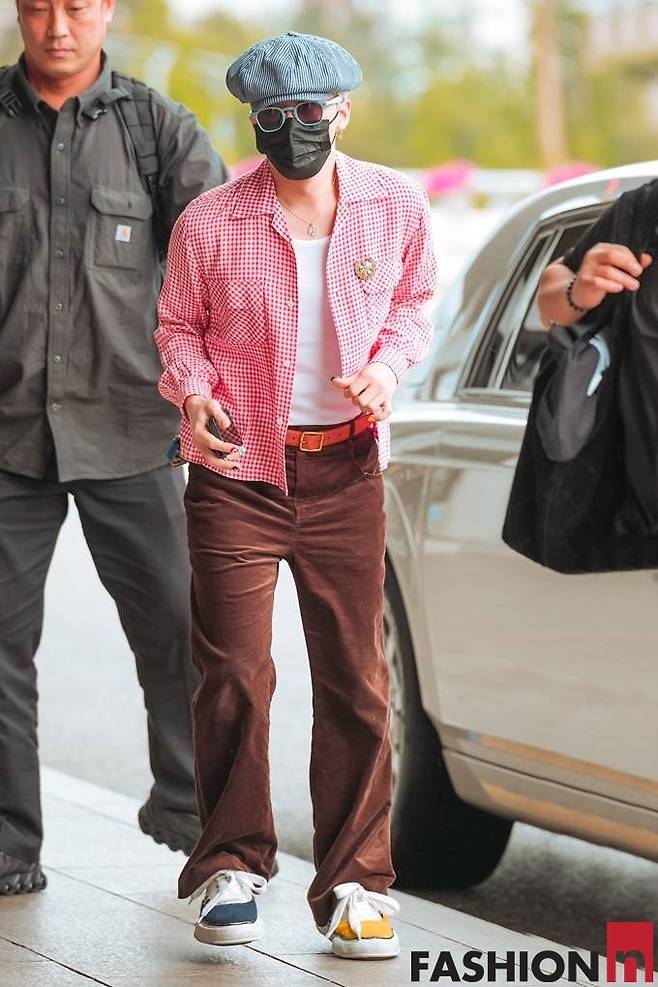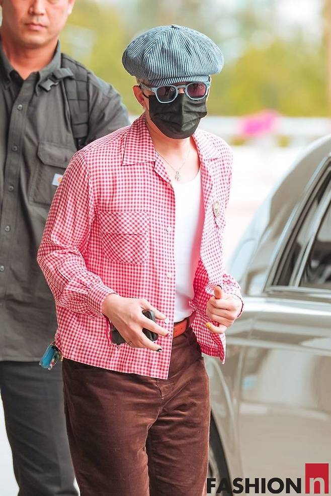 지드래곤은 이날 베레모와 마스크, 선글라스로 꽁꽁 감싼 레드 체크룩으로 시선을 사로잡았다.