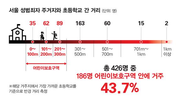실제 출소한 성범죄자들은 아이들의 생활 반경과 얼마나 가까이 머무르고 있을까. 시사저널은 전국에서 면적당 성범죄자 밀집도가 가장 높은 서울시 내 성범죄자 426명의 거주지와 인근 초등학교 간 거리를 전수 분석했다. 그 결과 약 44%에 달하는 186명이 초등학교에서 반경 300m, 즉 거리상 '어린이보호구역' 내에 거주하고 있는 것으로 나타났다. 초등학교와 걸어서 5~6분 거리인 반경 500m 이내로 범위를 넓히면 무려 82%(349명)에 달한다.