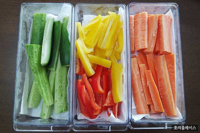 소분용기에 키친타올을 깔아두고 야채를 스틱형으로 손질해 보관하니 너무 좋더라구요. 세척해서 손질해 보관했는데도 일주일 정도는 신선하게 즐길 수 있어요.