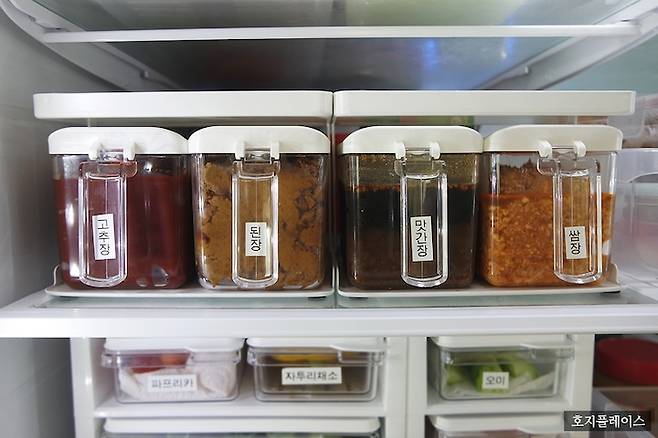 다음은 고추장, 된장, 맛간장, 쌈장 등 장류를 보관하는 칸인데요. 이번에 정리 하면서 가장 깔끔하고 뿌듯한 부분이 이 장류가 아닐까 싶어요ㅋㅋㅋ