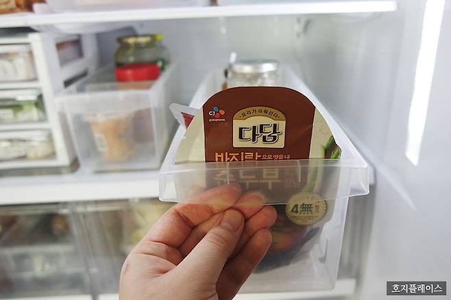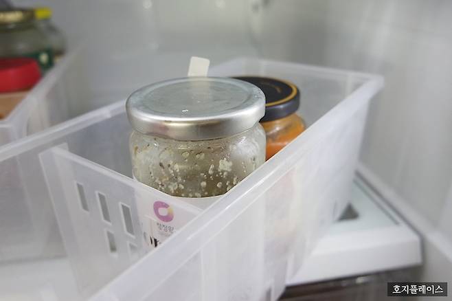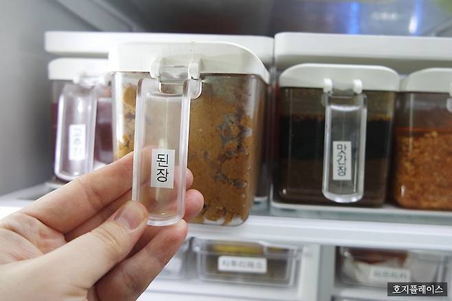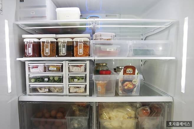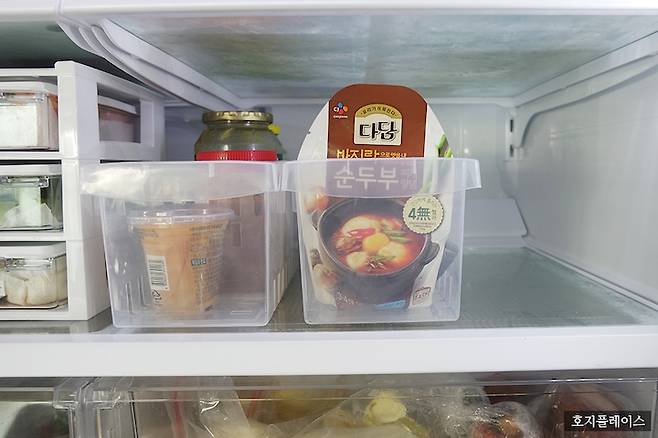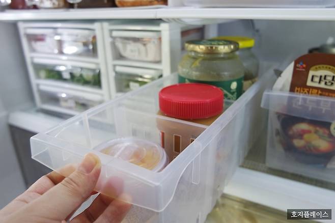 이렇게 용기를 통일했을 뿐인데 냉장고가 훨씬 깔끔해졌어요.