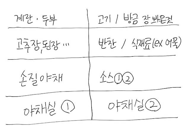 먼저 저는 핸드폰 메모를 이용해서 냉장고 칸을 나누고 어떤 칸에 어떤 음식들을 보관할지 분류했어요. 정말 고민 많이 하고 여기에 옮겼다 저기에 옮겼다 반복한 결과 저는 위 메모처럼 정리하는 게 최선이라는 결론을 내렸어요!