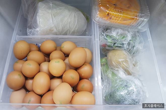 그리고 가득 쌓여있는 계란은 날계란이 아니라 훈제란이에요ㅎㅎㅎㅎ 간식이나 샐러드에 곁들일 용으로 좋아서 두 판을 쟁여놨답니다. 칸막이가 있는 트레이라서 정말 편하게 수납할 수 있었어요.