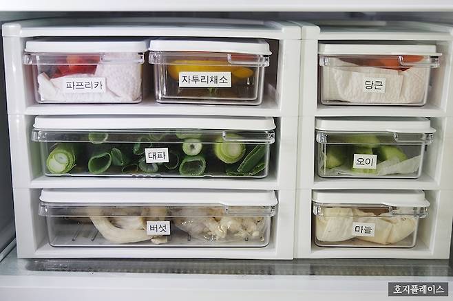 진짜 서랍처럼 라벨지도 붙여 놓으니 어떤 재료가 어디에 있는지 한 눈에 보여서 요리하는 시간이 많이 단축되었어요. 샐러드 채소 외에도 요리할 때 거의 매번 꺼내게 되는 대파, 버섯, 마늘을 보관했어요.
